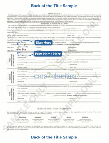 • You may need to notify the Alaska Department of Motor Vehicles that the vehicle was donated to complete the transfer. Please contact them to be sure.